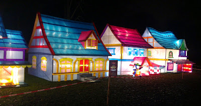 Voorzien van paraplu's gaan we de loopbrug over naar het park en zien het veelkleurige spektakel al van een afstand.