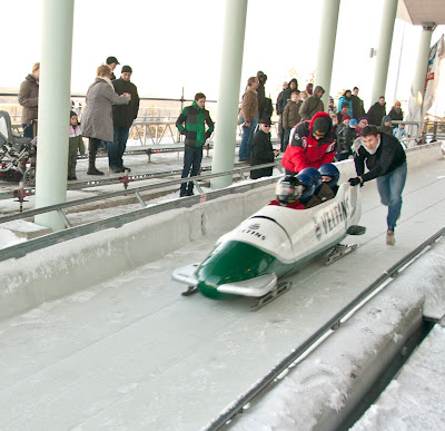 Tegen een uur of drie eten we wat in het restaurant en zakken daarna de berg weer af om ook even bij de bobsleebaan te kijken. Hier kunnen durfals ook een ritje maken en er is aardig wat belangstelling voor.
