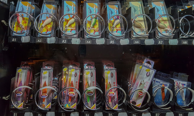 Hier vinden we ook een automatiek. niet meer snacks maar, met allerlei vishaken en kunstaas.